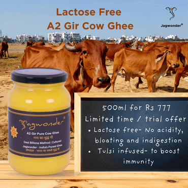 Experience the unparalleled purity and traditional richness of Jagwonder A2 Gir Pure Cow Ghee and A1 HF Pure Cow Ghee. Our ghee is meticulously crafted using the ancient Billona method, ensuring the highest quality and authentic taste. Made in small batches, it retains the rich flavor and nutritional benefits that set us apart. Infused with the goodness of Tulsi, Jagwonder Ghee promotes overall health and wellness. Ideal for cooking, baking, or adding a flavorful touch to your meals, our ghee embodies natural goodness and purity. Trust in the tradition and quality of Jagwonder for a healthier lifestyle.