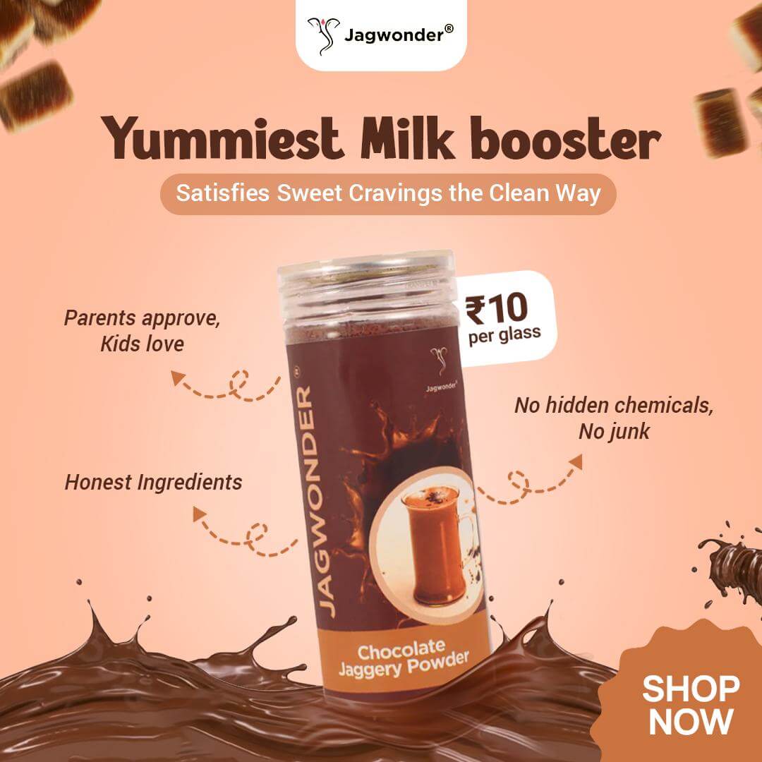 Jagwonder Chocolate Jaggery Powder is a delicious and nutritious alternative to sugary drink mixes. Made with pure jaggery and premium cocoa, it delivers rich chocolate flavor while supporting immunity, bone health, and energy levels.