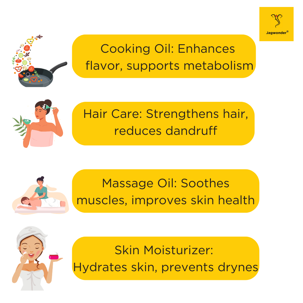 4. A Journey to Health: Jagwonder Cold Pressed Oil is not just a cooking essential; it is a wellness companion. Consume it consistently for three months, and you will witness remarkable improvements in your health parameters, from cholesterol levels to joint pain and weight loss. Our oil enhances digestion and brings transformative health benefits when used as recommended.