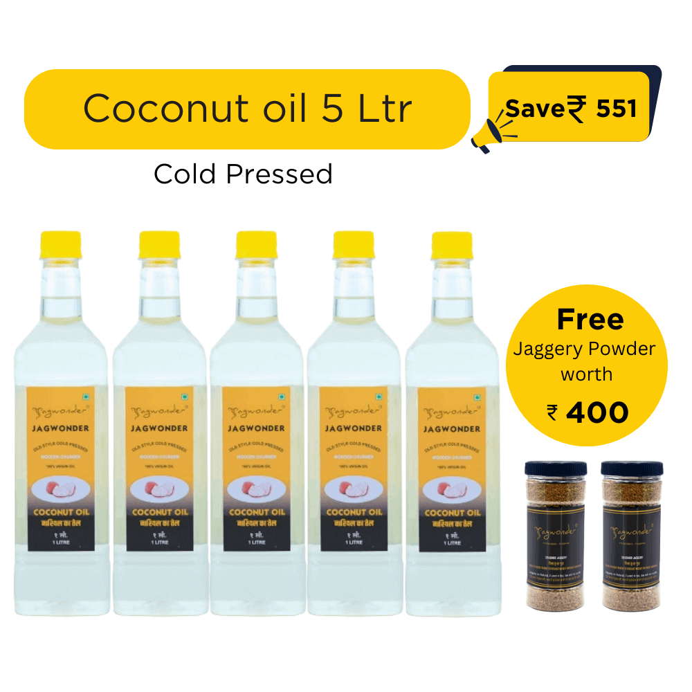 Jagwonder Cold Pressed Coconut Oil 5 litre (1 Litre 5 Bottle) + Free Gift Jaggery Powder ( 500gm 2 Jar worth RS. 400