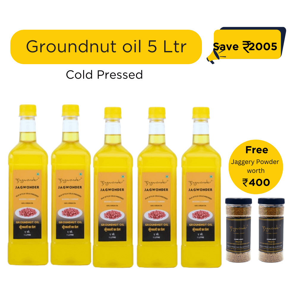 Jagwonder Cold Pressed Groundnut Peanut Oil 5 litre (1 Litre 5 Bottles) + Free Gift Jaggery Powder 500gm 2 Jar worth Rs.400