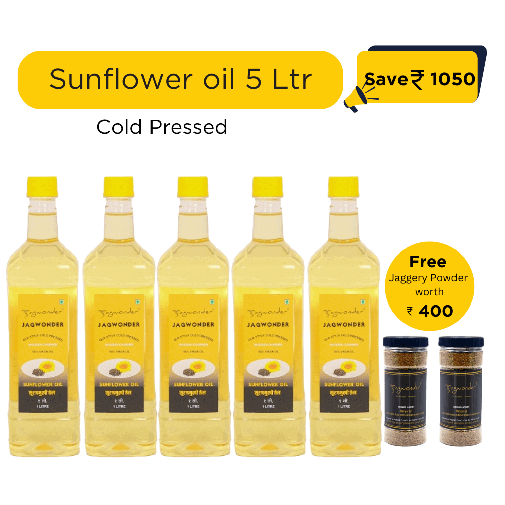 Jagwonder Cold Pressed Sunflower Oil 5 litre (1 Litre 5 Bottles) + Free Gift Jaggery Powder 500gm 2 Jar worth Rs. 400